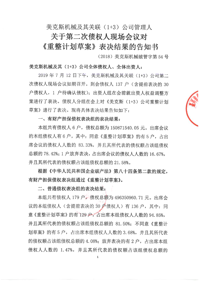 上一篇:美克斯机械及其关联(1+3)公司管理人关于人民法院批准重整计划的告知书