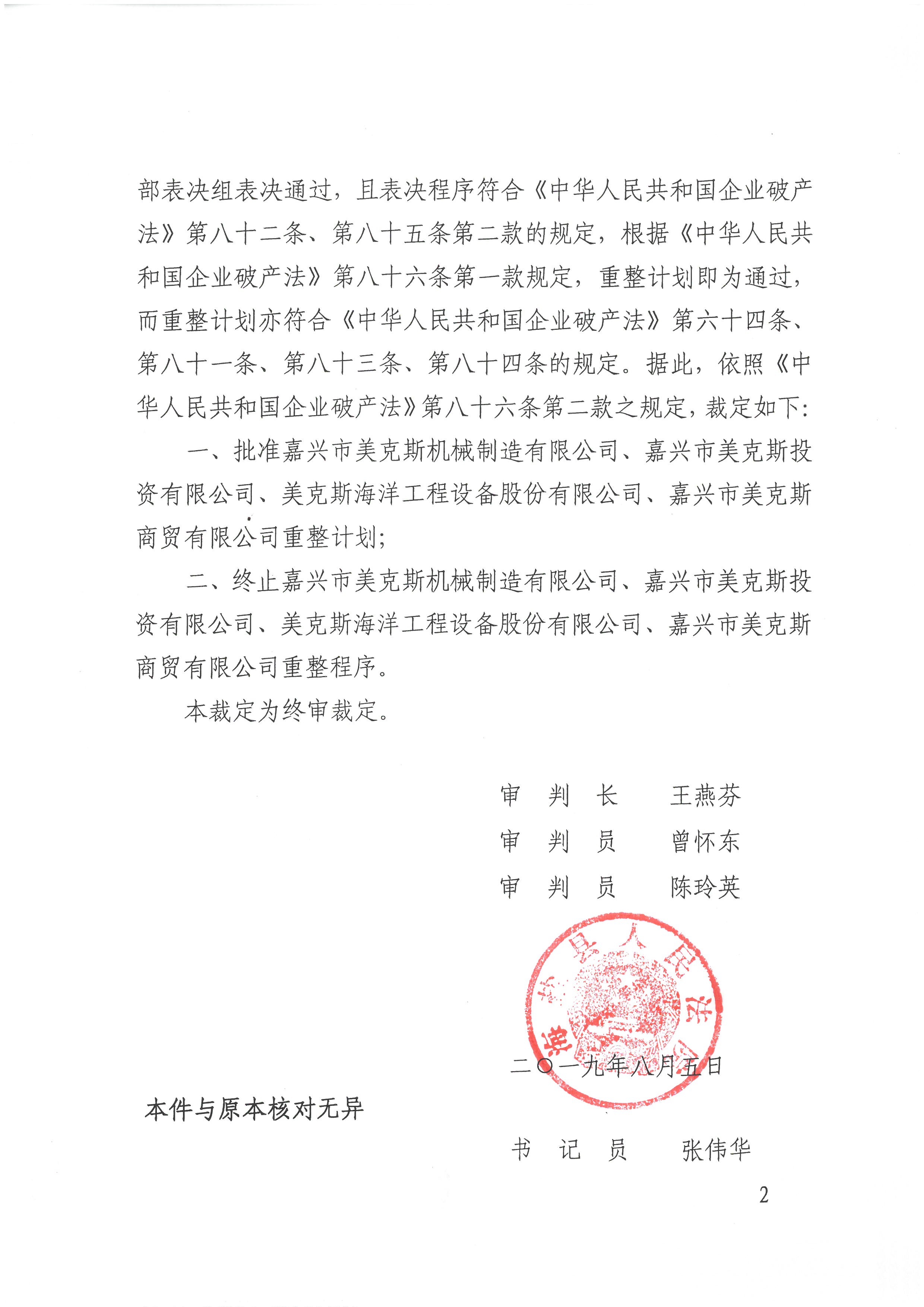 2019年8月5日,海盐县人民法院作出(2018)浙0424破10、11、12、13号《民事裁定书》,裁定:(一)批准嘉兴市美克斯机械制造有限公司、嘉兴市美克斯投资有限公司、美克斯海洋工程设备股份有限公司、嘉兴市美克斯商贸有限公司重整计划;(二)终止嘉兴市美克斯机械制造有限公司、嘉兴市美克斯投资有限公司、美克斯海洋工程设备股份有限公司、嘉兴市美克斯商贸有限公司重整程序。