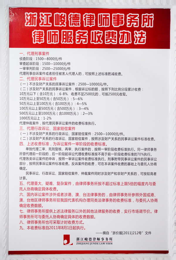 第二条、根据《浙江省律师服务收费标准》,确定本律师事务所律师服务收费执行标准。具体如下: